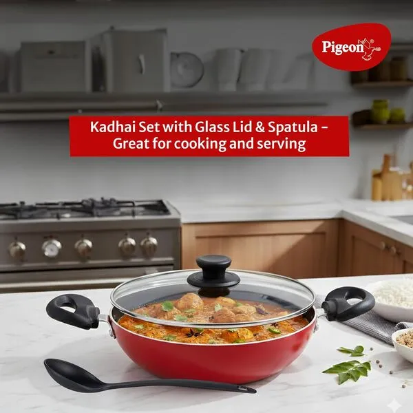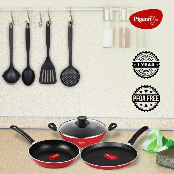 Material: Aluminium ; Size: Tawa (280 Mm), Fry Pan (240 Mm), Kadai (240mm); Base type: Non-induction base; Base thickness: 2.8 mm; Included components: 1 Tawa, 1 Fry Pan, 4 Kitchen Tool Set, Kadai With Glass Lid; Colour: Red